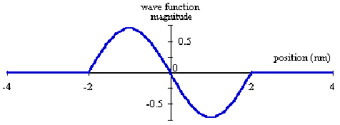 A large amplitude is related to a large probability while a small amplitude goes with a small probability. We have a slight complication. Waves can have amplitudes that are either positive or negative; probabilities must be positive numbers. The solution is to square the wave function. A square number is always positive. The wave function squared appears below in Figure 3.