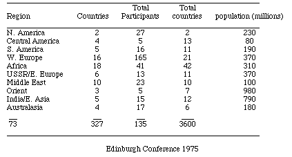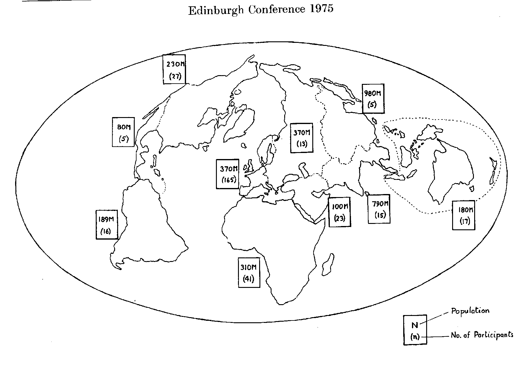 Although the Commission can claim some success in making its activities genuinely international, the picture is by no means fully satisfactory. To take a specific instance, the total attendance at the Edinburgh conference in 1975 was about 330 registered participants spread over 73 countries. However, when examined in close detail, the distribution was astonishingly non uniform. This is shown in the table and in the map. For convenience, the world has been divided here into ten main regions, as listed in the table. The number of participants averaged about one per 10 million of world population, but at one extreme was the Orient (primarily China and Japan) with only 5 participants from about 1000 million population (i.e., about one per 200 million) and at the other was Western Europe, with 165 participants from 370 million (i.e., about one in 2 million). Also very noteworthy, and regrettable, was the contrast between Western and Eastern Europe (including the U.S.S.R.) a factor of more than ten difference in the numbers of participants for essentially equal total populations. Of course, it is to be expected that the host country for a conference will be disproportionately represented, but this goes only a small way towards accounting for the big East-West difference just referred to. At an earlier conference, held in Hungary in 1970 the representation from Western Europe was 70% of that from Eastern Europe. Thus, much remains to be done if the scope of the Commission's activities is to be truly representative of the world's many different educational systems. The outstanding omission — which recent political developments may help to repair — has been any involvement at all from the People's Republic of China.