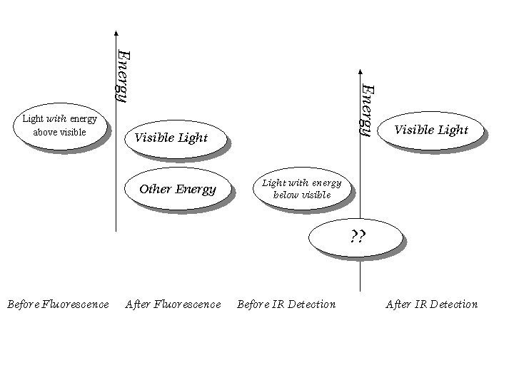 Fortunately, a small material enables them to "see" indirectly the infrared light. This IR detecting material converts infrared signals to visible light. At first the process may seem similar to fluorescence because it is converting light of one energy to light of another energy. However, IR detection is different from fluorescence in one very important way. In fluorescence a solid emits a lower energy than it absorbs; the rest of the energy goes to other forms. In IR detection, the material is emitting higher energy than it absorbs. This process is described graphically below.