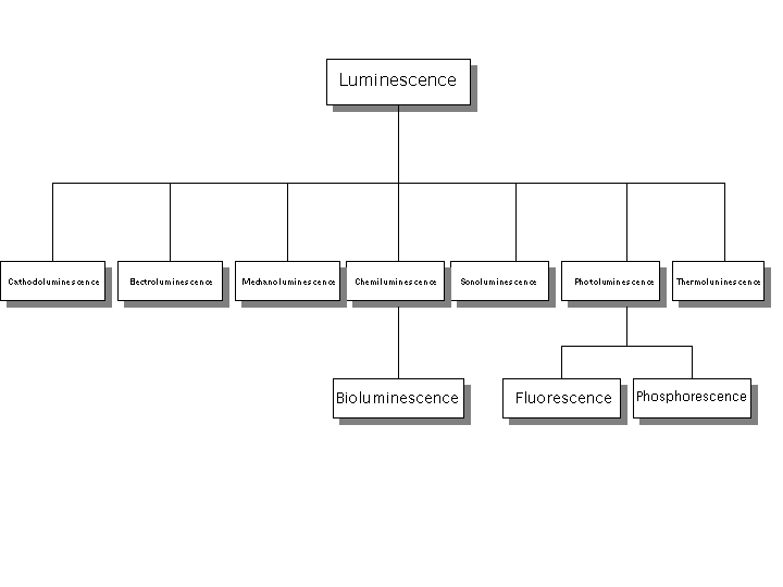 The face of the TV screen or computer monitor is lined with phosphors. The TV screen is slightly phosphorescent in that the the glow disappears rather quickly. When the TV is turned on, the phosphor coating absorbs high-energy electrons that are directed at them by a device inside of the TV. The phosphor releases this energy over time in the form of visible light. This process of light emission is called cathodoluminescence The name comes from cathode rays-a term used about 100 years ago to describe a beam of electrons. Our chart used to classify the different types of luminscence now has been modified to include cathodoluminescence. Refer to the diagram below.